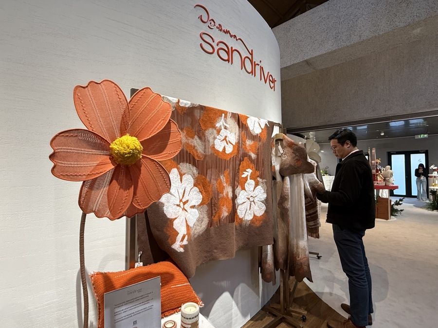 “踏花影”区域是一个五感体验的千里浸空间。艺术羊绒品牌Sandriver沙涓现场规复了日喀则羊绒氆氇工坊、果洛牦牛绒氆氇工坊的织机操作,匠东谈主以双手穿梭,在经纬交错间演绎“高原的温度”,破钞者能近距离不雅看从捻纱到成胚的全经由,感受这一非物资文化遗产的匠心精神。沙涓品牌发达东谈主先容,品牌将首发羊绒睡袍系列新品、马年主题哈尼绣系列以及羊绒艾德莱斯家居毯等作品,展现传统工艺与现代生计好意思学交融的羊绒设想。