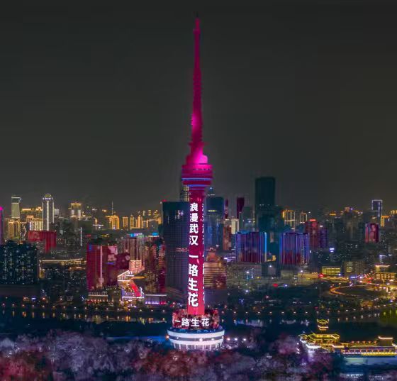 “长江之夜”樱花主题灯光秀,武汉龟山电视塔“一起生花”