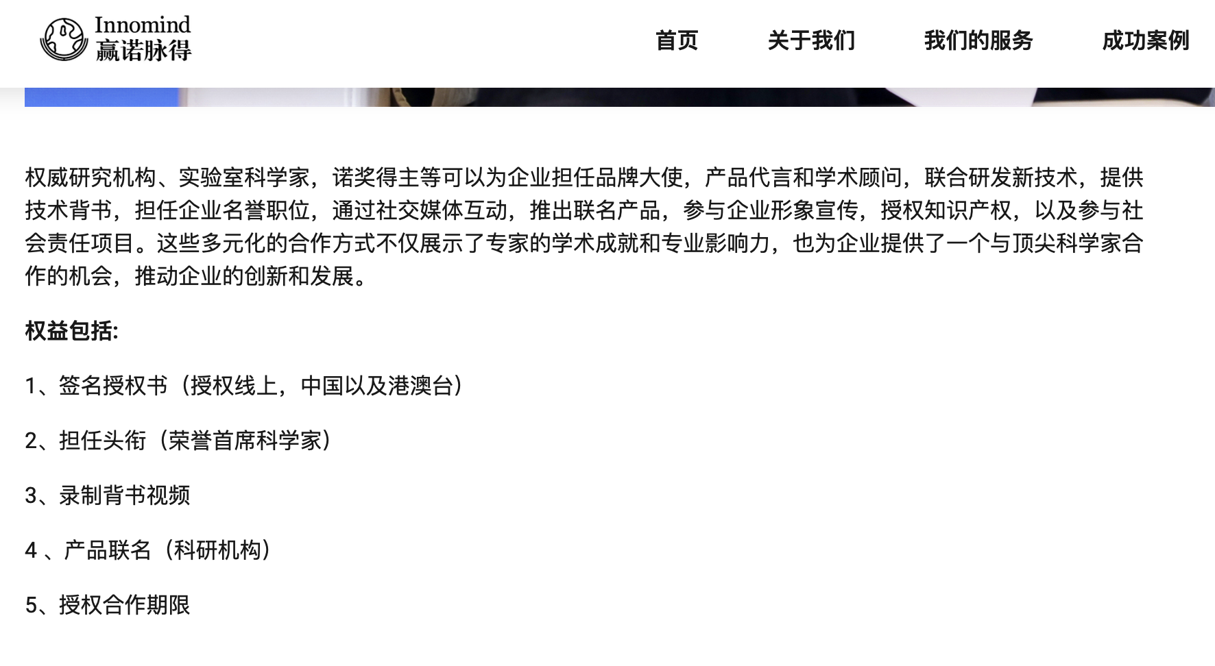 一家名为“赢诺脉得”的中介公司,官网宣传从事“邀约诺奖得主及顶尖科学家为品牌赋能”业务,可为企业邀请诺奖得主授权使用“荣誉首席科学家”名称、出镜录制背书视频,大致建立不时现实室、责任站。