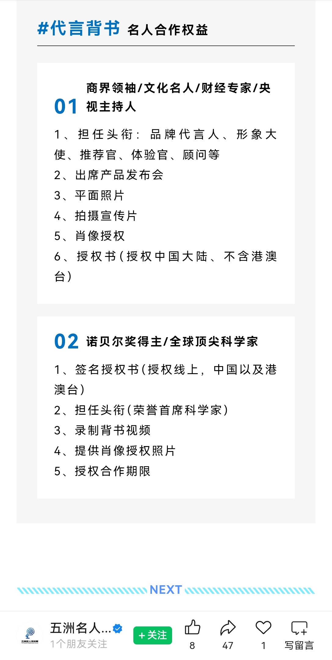 “五洲名东说念主演讲局”的代言背书信息(微信公众号截图)