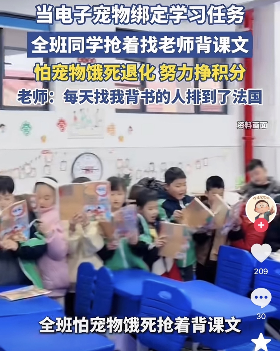 勤快完成效课、背诵课文,包括主动匡助他东说念主,齐能为电子宠物换来“食品”;反之,宠物口粮就会被扣掉,以致会被“饿死”。近期,一款类似“电子宠物”的教学赞成软件出刻下世界多地中小学课堂,有西宾在酬酢平台共享:为了不让宠物“饿死”,全班学生争先背书,队伍“排出天空”。