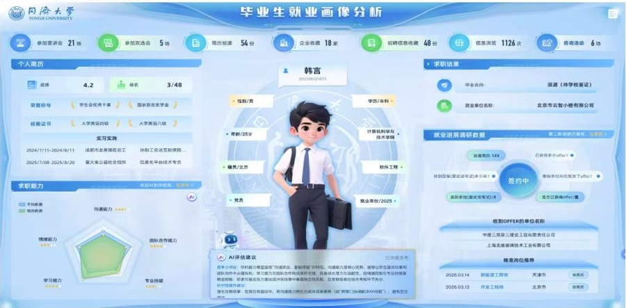 “以前是东谈主找岗亭,现时是岗亭找东谈主。”同济大学一套全新的管事大数据系统深度整合学生成长档案,对学生的管事意向、专科布景、才能教训等进行科学画像,竣事管事信息的精确匹配与个性化推送。