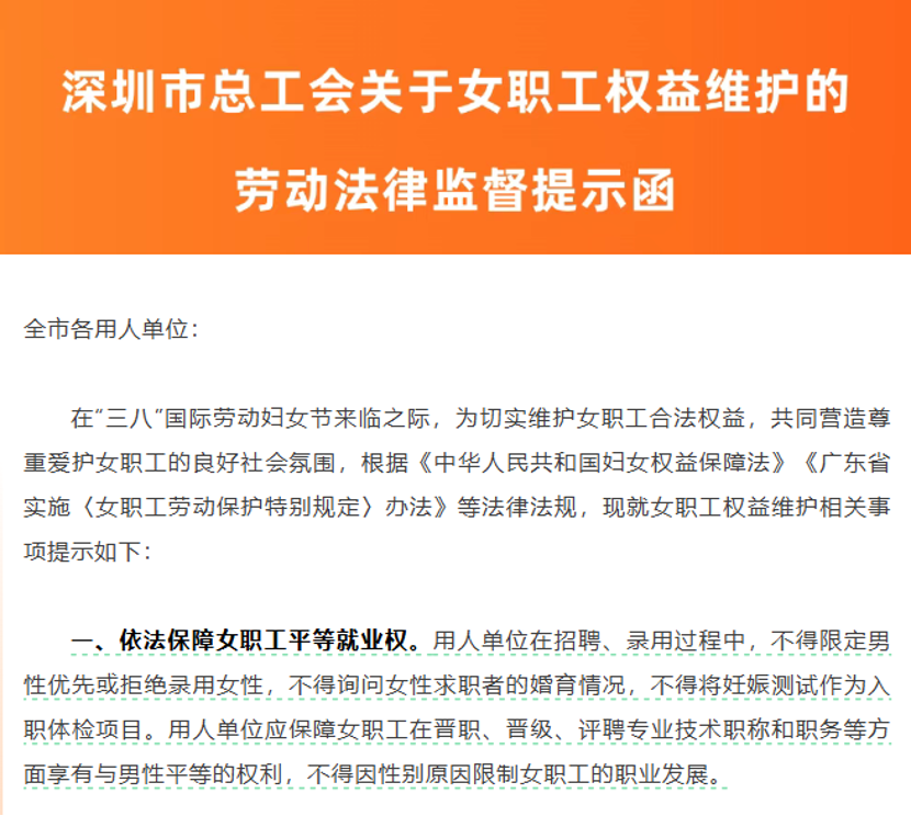 2025年3月,深圳市、湖南省、青海省等多地工会发布“劳动法律监督指示函”,明确提醒各用东谈主单元保险女员工正当权益,包括对等办事权、生养权益、劳动保护与健康留心等多个方面。